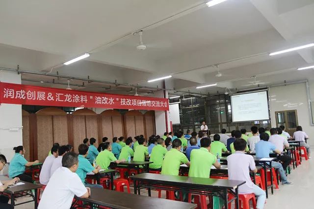 为广大消费者提供更好的产品,7月14日晚,由润成创展联合汇龙涂料举行了“油改水”技改项目落地交流大会,会议主要由汇龙涂料公司主要技术人员给我司相关人员加深水性漆的知识以及讲解在“油改水”施工过程中的要点、痛点与难点,为我司相关人员在技术上提供更好的帮助,以致力于消费者的健康,可谓任重而道远。