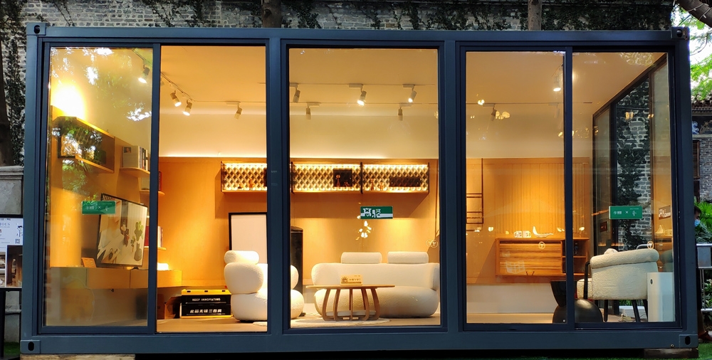沙发、茶几、墙柜......这些家居常见的组合,这次统统装进集装箱里,店内的设计沿袭了“离骚”系列原木、时尚的调性,沉浸式空间体验独具特色的亲宠功能单品,让真实的生活在空间中安静流淌,体验实木家具定制的同时,也给了萌宠尽情撒欢的空间。从现场的照片中不难看出,“离骚”的场景体验互动,让人们能直观感受到木作整装的精湛工艺,为消费者带来从产品到居家的人·宠·生活多重体验。