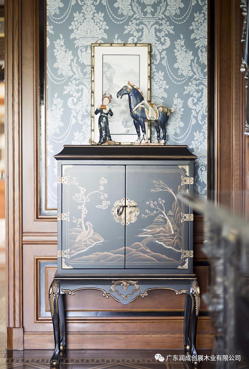 ▲黑色的柜子,中式的元素,木色的背景墙,很巧妙的融合在一起。