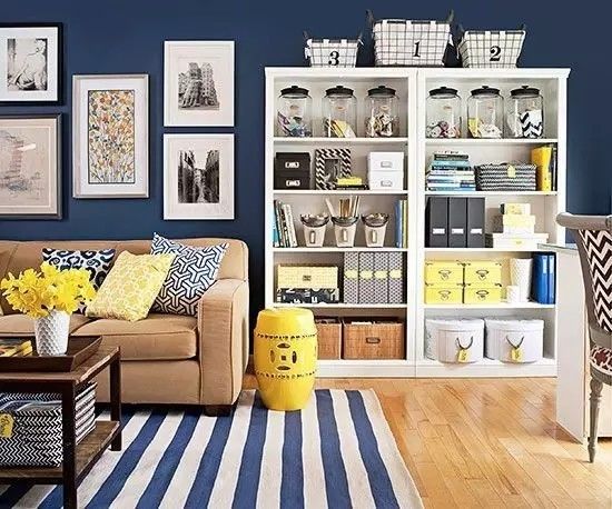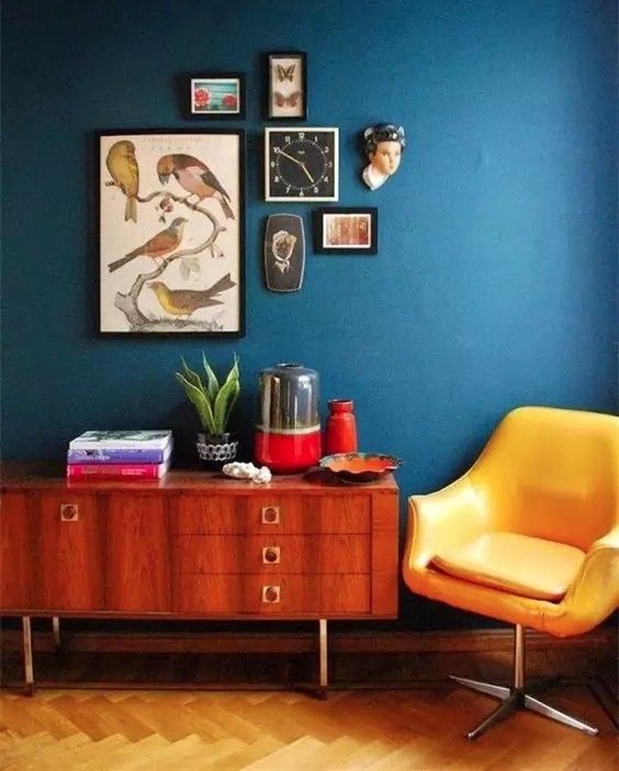 麦田黄与海军蓝是来于自然的色彩CP,惬意感受秋之美。墙面用海军蓝打底,搭配以麦田黄的沙发、椅子、花瓶,两种不同色调表现出强烈的视觉冲击力,营造出高贵复古的感觉,正好映出秋天收获的喜悦。