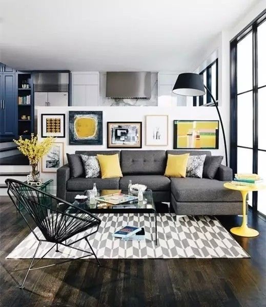 银杏黄与高级灰用极致优雅的色彩讲述秋天的故事。灰色的布艺沙发用黄色的抱枕、脚蹬、花瓶点缀,冷暖色调交融,恢弘大气,魅惑动人。