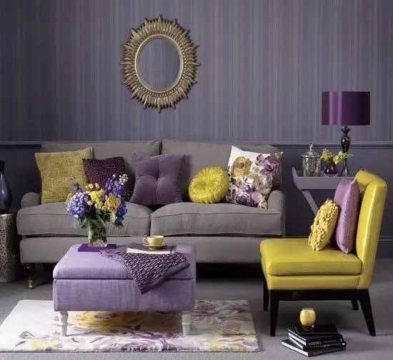 淡紫色墙面为空间增添了高贵感,黄色单人沙发提亮空间。或者是素雅的客厅里,用花瓶、果盘、台灯等单品的颜色丰富视觉效果。