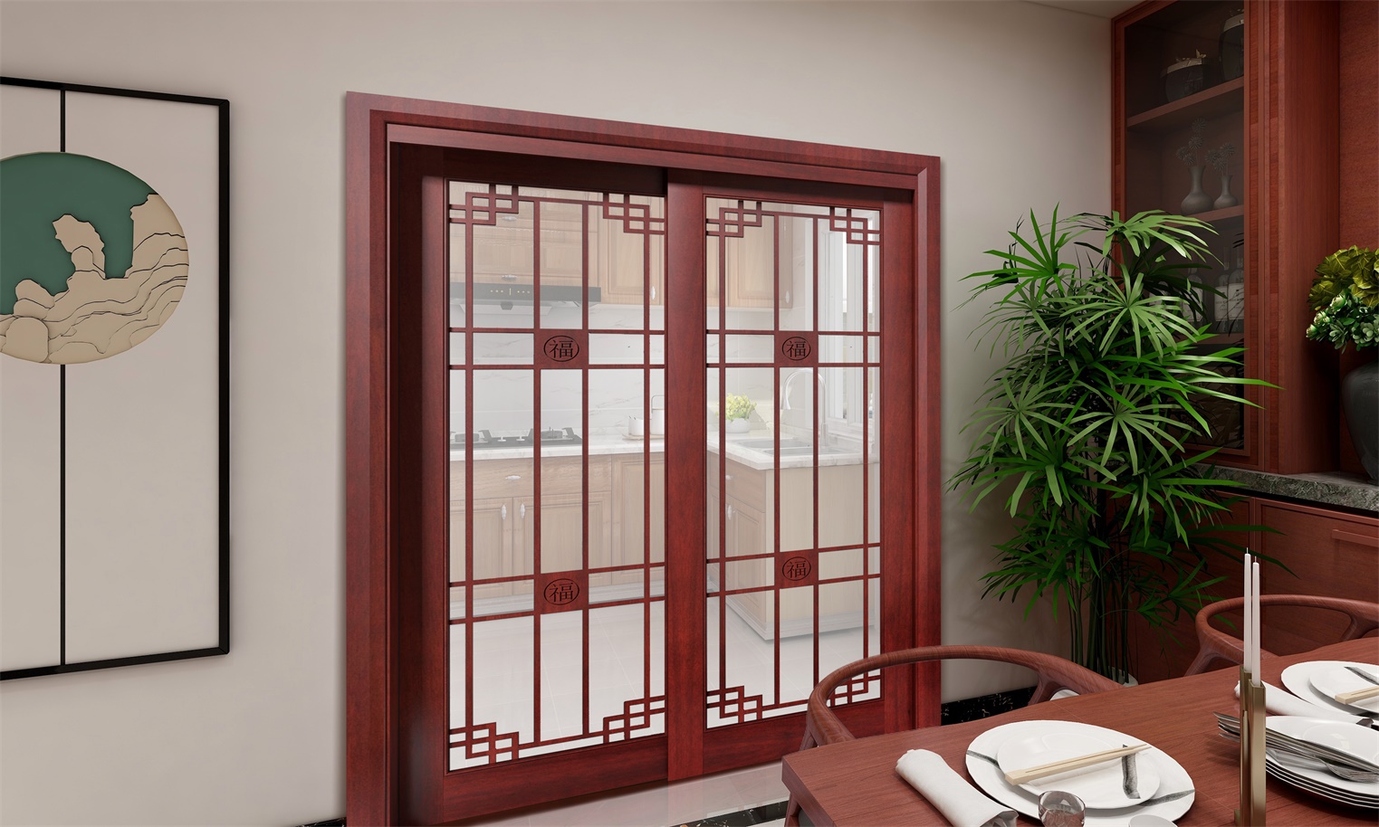 润成创展木业“枫晚”精致的中国结花纹,深红的色调,处处都充满着中国传统喜庆的气息。搭配透明的玻璃,让室内明亮宽敞,营造出朝气蓬勃的气氛。